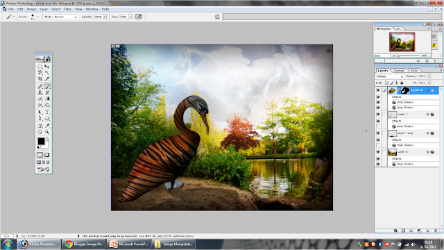 The artist has manipulated this piece using four different images, which I think is very hard to believe when looking at it. Another thing is that the seagulls were not in any of these four images. He has created a very dramatic scene by looking out to sea; this is enhanced with waves that are crashing into the rocks. He has also used a wide range of shadows which also help emphasise the dramatic effect.